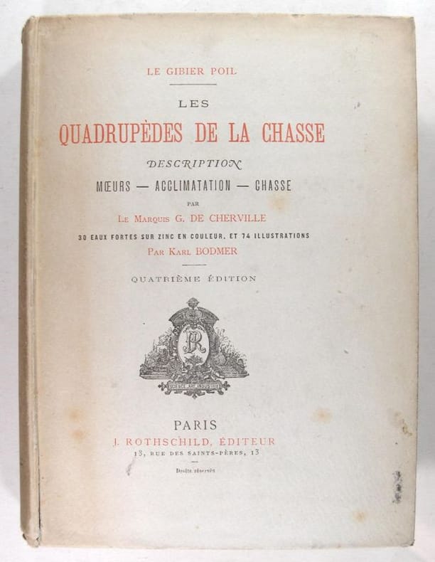 paris J. Rothschild 1885 in-8 pleine percale un volume, reliure pleine percaline bleu-gris cartonnage polychrome in-octavo Editeur à plaques spéciales polychromes pour le dos et les plats (editor hard-back percale with special covers editor for the spine and the cover in-octavo) (19,2 x 14 cm), plaque spéciale or et noir pour le dos avec un motif "Tête de Cerf et Tête de Lièvre", plats biseautés, 1er plat illustré en vert, marron, fauve, noir et or sur fond bleu-gris : "Thème Chasse à Courre", toutes tranches lisses rouges (all red edges), reliure signée : "CH. MAGNIER REL.", orné de 74 vignettes dans le texte en noir + 30 eaux-fortes hors-texte par Karl Bodmer, tirées en bistre sur papier gris, encadrées d 'un filet doré, sous serpentes roses, 226 pages, sans date (1885) Paris, J. Rothschild, Editeur Editeur,