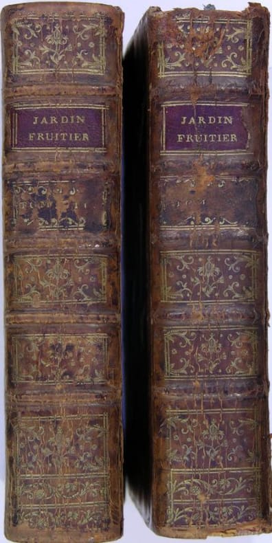 A Paris, chez Eugène Onfroy, 1784. 2 volumes in/12 reliure plein veau du temps, dos à nerfs à caissons dorés et pièce de titre rouge, tranches rouges, tome 1 : lxxvj ff. de tab..., 546 p. - tome 2 : viij ff. de table, 658 p., 1 ff. d’approbation. Reliures frottées : coiffe supérieure du tome 1 abîmée, garde avec manque ; auréole en marge intérieure des 12 premiers feuillets du tome 1 : taches décroissantes sur les 9 premiers feuillets du tome 2 ; taches éparses en p. 254, 300 et 380. Le choix des arbres, leur plantation & transplantation ; les pépinières, les greffes, la taille & les formes qu’on peut donner aux arbres fruiters ; l’ébourgeonnement ; leurs maladies & accidens &c. Enfin la culture de chaque espèce d’arbres fruitiers, leurs propriétés & le journal de tous les ouvrages qui se font dans le Jardin fruitier pendant le cours de l’année. Ouvrage fait pour servir de suite à l’Ecole du jardin potager.