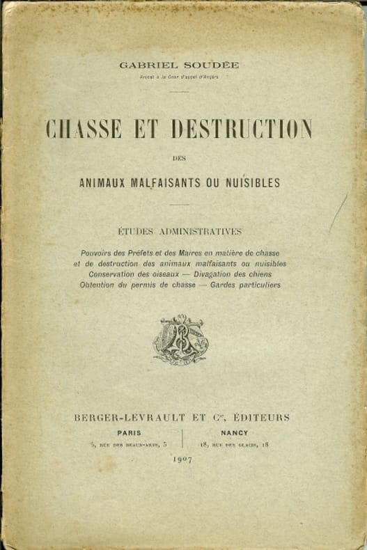 Etudes aministratives : pouvoirs des Préfets et des Maires en matière de chasse et de destruction des animaux malfaisants ou nuisibles - conservation des oiseaux - divagation des chiens - obtention du permis de chasse - gardes particuliers. Thiebaud col. 852.