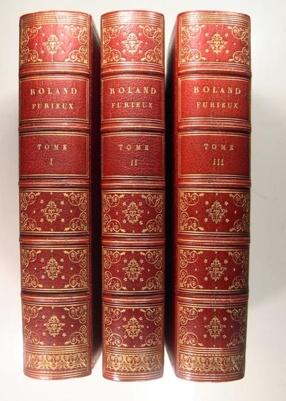 Le relieur Niedree fut distingué pour son travail en 1844. Il était réputé pour ses reliures de style Renaissance ; “la conservation des marges était pour lui l’objet des plus grands soins.”Orlando Furioso, ou Roland furieux est un poème épique de 40 chants, écrit par Ludovico Ariosto, dit en français l'Arioste, écrit au début du XVIe siècle, le Cinquecento italien, il sera publié en 1516. S'inscrivant dans le cycle carolingien comme un lointain descendant de la Chanson de Roland (ou Chanson de Roncevaux) et présenté, à sa sortie, comme une suite de l'Orlando Innamorato (Roland amoureux) de Matteo Maria Boiardo. Le poème fut écrit en ferrarais, le dialecte utilisé à Ferrare, puis l'Arioste lui-même l'adapta en toscan littéraire, afin qu'il soit plus accessible pour le reste de l'Italie. Roger et Bradamante y sont présentés comme les ancêtres légendaires des ducs de Ferrare, et donc du cardinal Alphonse d'Este qui était le protecteur de l'Arioste et sans doute le commanditaire du livre.