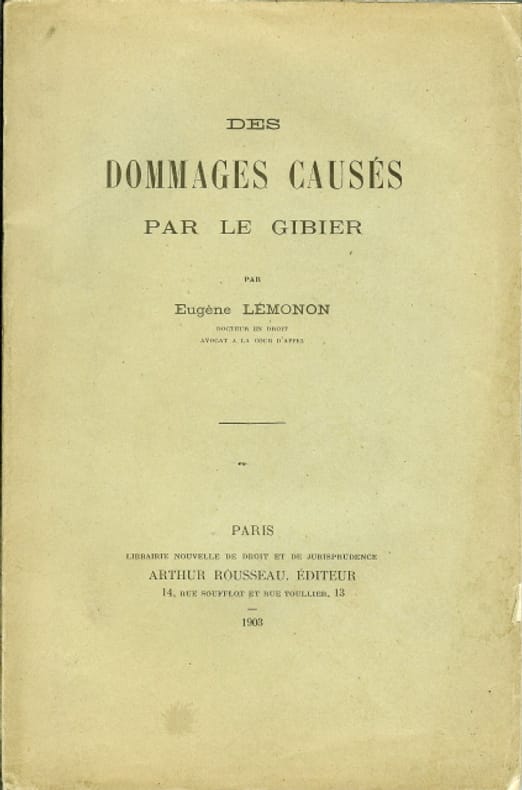 Thèse pour le doctorat de droit soutenu le 18.12.1900. Aperçu historique, principes généraux, personnes responsables, des diverses espèces de gibier entraînant la responsabilité, compétence, procédure, voies de recours, législation comparée (en différents pays d’Europe). Thiebaud col. 25. Fermeture de la Librairie du 30/12/2025 au 11/01/2026