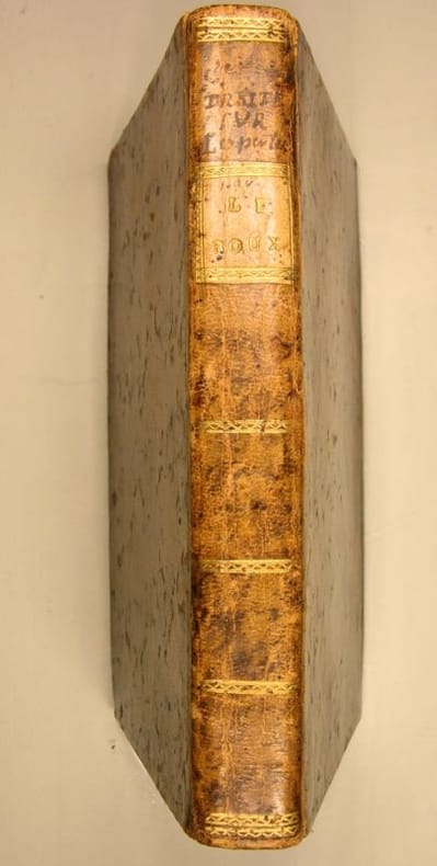 Antoine Michel Leroux (Dijon 1730 - 1802), chirurgien de l’hôpital de Dijon, acquit la réputation d’un des meilleurs praticiens de son temps. Il mourut empoisonné par une dose trop forte d’opium qu’il utilisait pour calmer ses crises de “gravelle”. Le présent ouvrage est le plus important de Leroux et lui valut le titre de membre correspondant de la Société royale de médecine de Paris. On lui doit également différents ouvrages sur la rage.8vo in contemporary full marbled calf , smooth spine with label, red edges, [22], 334 p., [2].Ex-name label, a fine copy except 2 decreasing spots on the seven first sheets. Antoine-Michel Leroux (Dijon 1730 - 1802) was surgeon on Dijon Hospital, and get the reputation of being one of the best practitioner of those days. He died poisoned by a higher dose of opium, that he used to calm his gravel crisis. This is the most important book writen by Leroux, that made him access to the title of correspondant member of the Royal Society of Medicine of Paris.