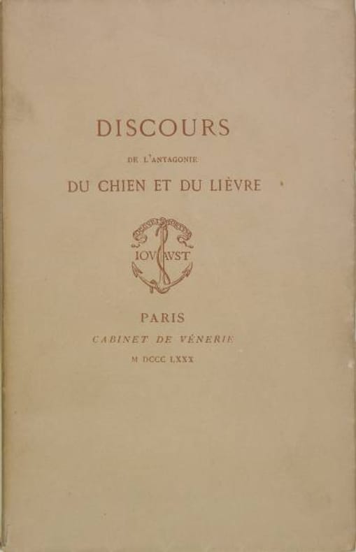 Paris, Librairie des Bibliophiles, 1880, volume I du “ Cabinet de Vénerie “. In/12 broché, couverture imprimée et rempliée, 2 ff. n. ch., XXIV p., 83 pages. Tirage limité à 300 exemplaires numérotés, celui-ci sur papier de Hollande.
