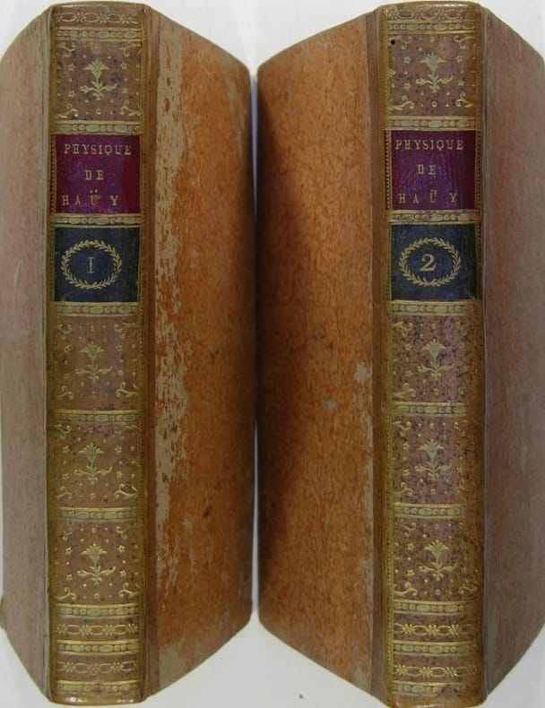 HAÜY abbé. Traité élémentaire de physique. Troisième édition, revue et considérablement augmentée. Tome second In 8 plein veau glacé, fauve, raciné, dos lisse, pièce de titre et de tomaison cuir vert foncé. Roulette, fers, palmette, filets dorés, roulette et filets dorés en encadrement, avec armes du collège Royal de Henri IV, sur les plats. Fleurs de lys en écoinçons. Faux-titre, titre, 452 pages, 1 page de table des matières, 1 page d’errata. Complet des 12 planches dépliantes, gravées, en fin de volume. Paris bachelier, successeur de Mme Vve COURCIER, libraire 1825. Très bon état.
