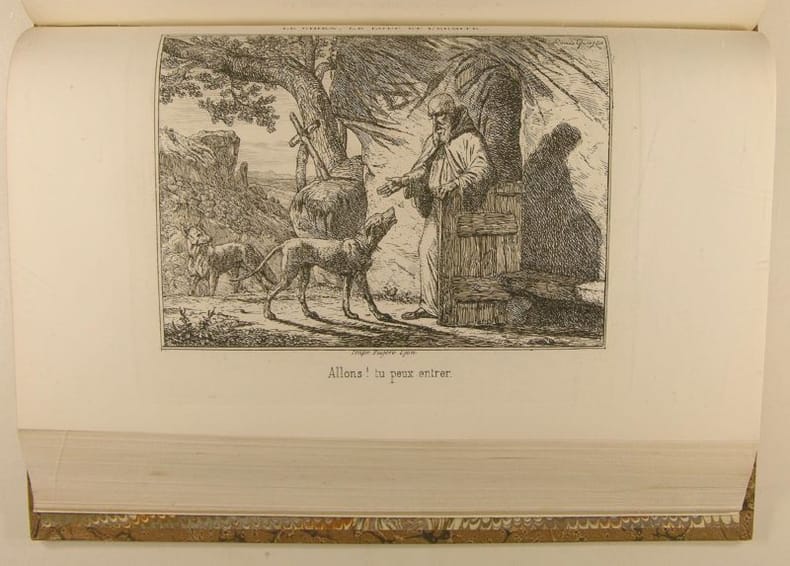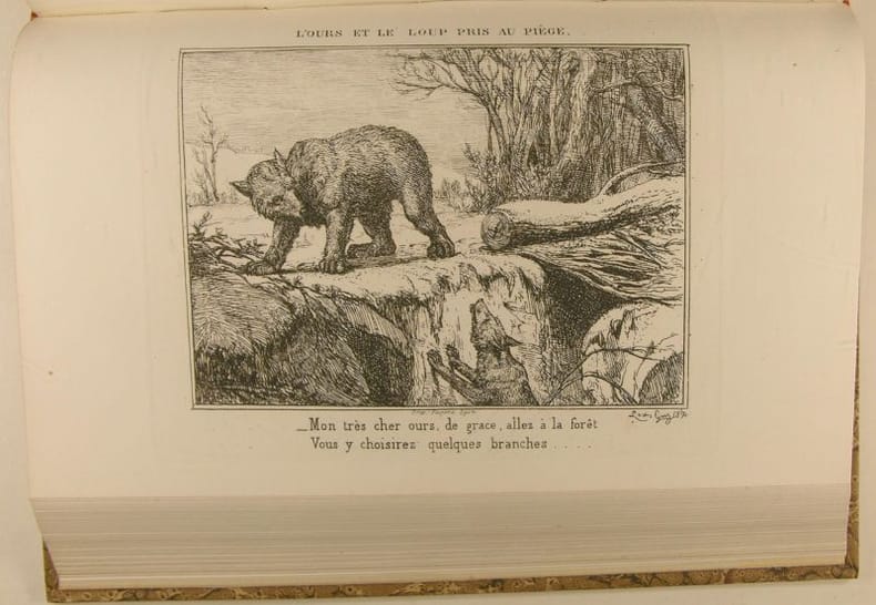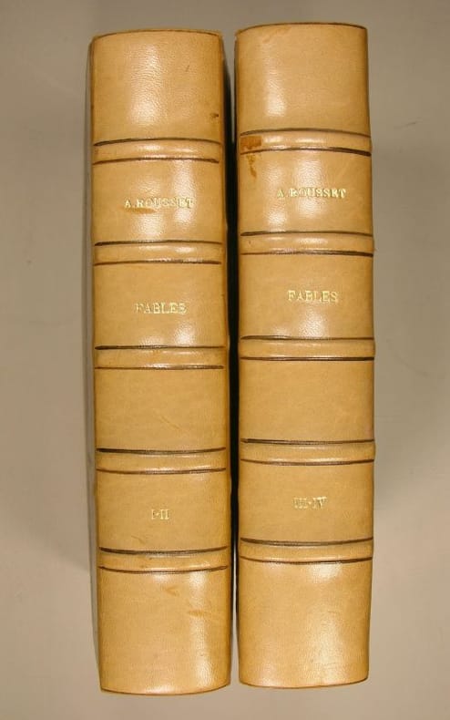 Paris, L. Maison éditeur, 1856. 4 tomes en deux volumes forts in/8 reliure demi-basane havane, dos à nerfs à titres dorés, couvertures et dos conservées (premier plat illustré d’une gravure) illustrations : 1 frontispice, 28 planches hors-texte dont certaines sur chine contrecollées, nombreuse vignettes, Tome 1 : 288 pages - Tome :: 283 pages - Tome III : 288 pages - Tome IV : 288 pages, in fine XXI pages table générale par ordre alphabétique des fables contenus dans les quatre volumes.