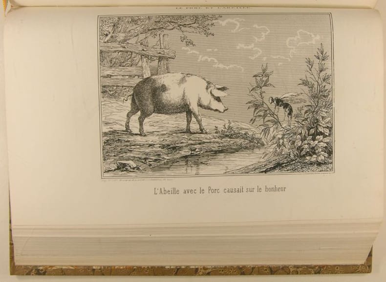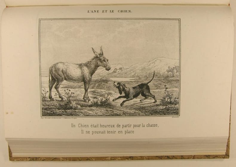 Fables inédites des XIIe, XIIIe et XIVe siècles, et Fables de La Fontaine rapprochées de celles de tous les auteurs qui avoient, avant lui, traité les même sujets.Précédées d'une Notice sur les Fabulistes par A.C.M. Robert, Conservateur de la Bibliothèque Sainte-Geneviève. Orné d'un portrait de La Fontaine en frontispice, de gravures en taille-douce et de fac-simile.Paris, Etienne Cabin, Paris, 1825, in 8°, reliure demi-chagrin, 603 pp., sur papier de Hollande, usures en coins, quelques rares et légères rousseurs. Le Pâtre et le Lion. Le Lion et le Chasseur. Phébus et Borée. Ysopet-Avionnet, De la Comparaison et contens du Soleil et du Vent de bise. Jupiter et Le Métayer. Le Cochet, le Chat et le Souriceau. Anon Vet. Ined. de Gallo et Mure. Ysopet I, Du Coc et de la Souris. Etc.Table des fables inédites d'Ysopet I et d'Ysopet-Avionnet. Table des fables inédites d'Ysopet II. Table par ordre alphabétique de toutes les Fables de La Fontaine. Notice des principales éditions des Fables et des Oeuvres de Jean de La Fontaine par BARBIER.Tome II. uniquement