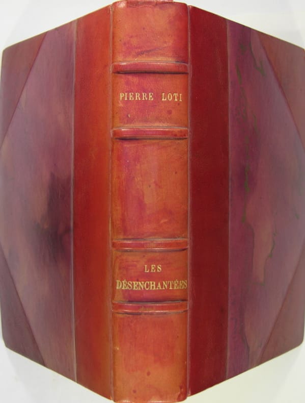 Edition originale (dénuée de mention d'édition). L'ouvrage - revêtu d'une agréable reliure - s'ouvre sur un frontispice photographique figurant l'auteur. ''Avec Les Désenchantées, Pierre Loti mêle, en une exquise alchimie, réalité et fiction. Dans le mystérieux chassé-croisé de l'intrigue, Loti, le nostalgique de l'Empire ottoman, prend la défense de la femme turque et plaide pour son émancipation. Au début du XXe siècle, un écrivain français déjà célèbre occupe un poste diplomatique à Istanbul. Une jeune femme de la haute société turque et deux de ses amies entrent secrètement en contact avec lui. Entre ces admiratrices voilées, prisonnières d'un mode de vie ancestral et l'auteur captivé se met en place un jeu relationnel subtil et violent où émotions et sentiments parfois contradictoires s'expriment dans un décor envoûtant. Entrez dans ce monde chimérique avec harems, amours impossibles et mort inéluctable... Ce mélange d'ingrédients fit, dès sa parution - le succès du livre. Le lecteur y retrouvait alors le charme insidieux des couchers de soleil sur le Bosphore, les promenades en caïque aux Eaux-Douces d'Asie et les incomparables évocations d'Istanbul, la ville tant aimée. À cette douce magie orientale, s'ajoutaient les destins tragiques de femmes éprises de modernisme, de liberté d'apprendre, d'agir et d'aimer. Tout à la fois ancrée dans son époque et annonciatrice de recherches littéraires contemporaines (personnages en quête d'auteur, roman dans le roman, mélange du «je» et du «elles»), cette œuvre fascinante est aussi un livre étonnamment moderne qui pose sur les débats actuels un regard aigu et leur apporte une saveur inattendue.'' Carteret II, Le Trésor du bibliophile romantique et moderne, p. 86. Angles et coiffes très légèrement élimées. Très rares rousseurs dans le texte. Du reste, belle condition.