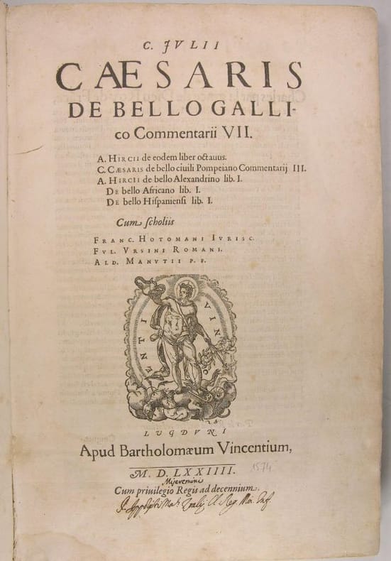 Adams page 220. La Guerre des Gaules ou Commentaires sur la Guerre des Gaules (en latin Commentarii de Bello Gallico) est un ouvrage d'histoire en sept livres de Jules César constitué de notes rédigées au fur et à mesure de la guerre et rassemblées vers 52-51 av. J.-C. dans lequel il relate ses opérations militaires lors de la Guerre des Gaules qui se déroula de 58 à 52 av. J.-C. et dont il fut le généralissime victorieux. Un huitième livre écrit plus tard par Aulus Hirtius décrits des derniers combat de 51 av. J.-C. et la situation en Gaule en 50 av. J.-C.4to in full vellum ; head & tail-pieces, historical letters, 11 woodcuts ; [8], 21 p., Franchotomani : 173 p., [10]. Few flaws : spine strengthened with vellum too ; waterstain on lowerborder of the 8 first sheets ; some foxing and oxidized sheets. Fine typography. A very good copy.