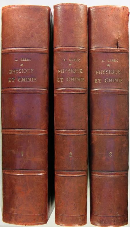 Paris Jules Rouff et Cie, 3 volumesn In 4, demi basane bleue, titre doré .Tome 1 et 2 : Physique :- pesanteur - chaleur - acoustique électricité statique - magnétisme - électricité dynamique - optique - . Tome 3 : Chimie : - métalloïdes - métaux - chimie organique - 820 et 1243 pp. (pagination continue dans les tomes II et III); (reliure de l'époque). Avec 21, 12, et 18 grandes gravures hors texte et 458, 284, et 214 in texte