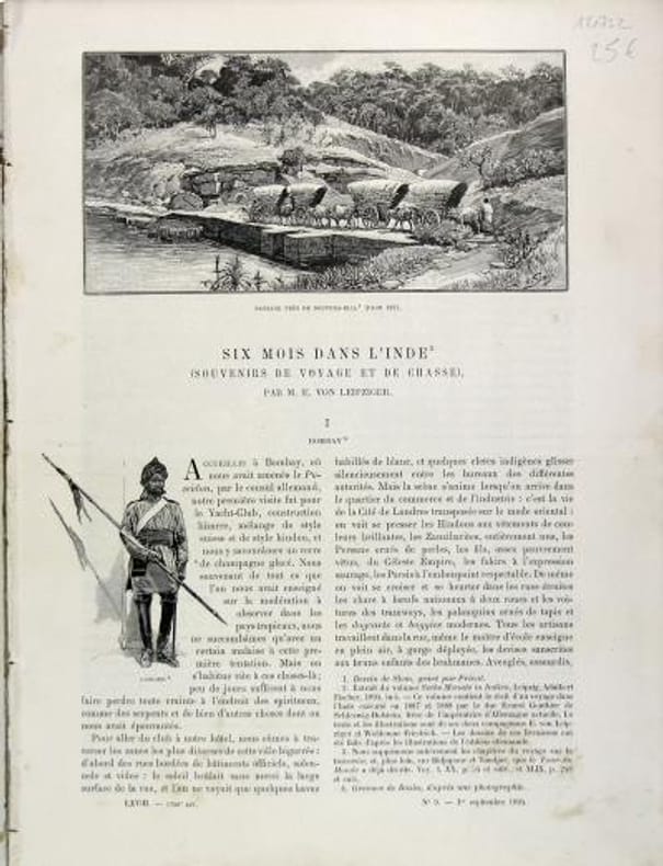 Extrait du volume Sechs monate in Indien,récit d'un voyage exécuté en 1887 et 1888 par le duc Ernest Gonthier de Schleswig-Holstein. Bombay-Ceylan,illustré d'une gravure d'une rue de Haïderabad. Madras et haïderabad,illustré d'une gravure d'un Sheep Cutting, une autre gravure d'une chasse à l'antilope. Chasses dans le Travankôr,illustré de gravures dont: danse dans les montagnes, ; devant Djounagarh. le catch et le Kattyawar, illustré de gravures dont: dans l attente (gravé par Privat). Radjpoutana -dernières chasses. Classification Dewey : 70.4412-Le journal des voyages