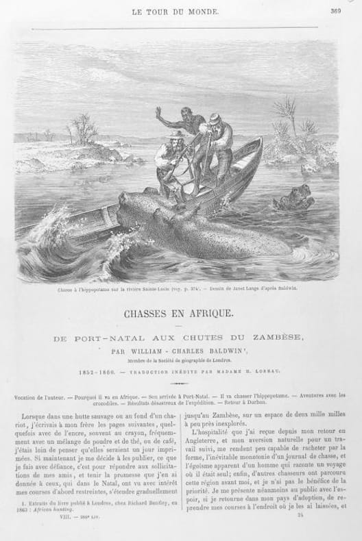Extraits du livre publié à Londres, chez Richard Bentley “African Hunting”. Chasse à l’hippopotame, l’éléphant, à la girafe, au rhinocéros, au crocodile, à l’autruche, au lion, harrisbuck (aigocère noir), babouins, aux serpents, aux antilopes coudous.