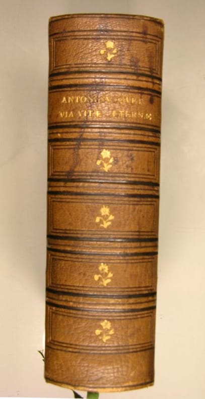 Antwerpiae, Martini Nutij, 1620. Fort volume in/8 reliure postérieure en demi-maroquin à coins, dos à nerfs à fleurons et titre dorés, tranches rouges, 7 f., 875 pages, 10 f., 32 planches par Böetium A. (Boëce) de Bolswert. SUCQUET Antoni (Antoine) Société de Jésus. Ouvrage en excellent état, avec de rares rousseurs et un tampon de bibliothèque.