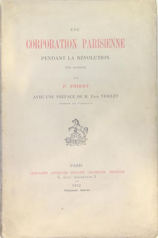 La confrérie des notaires au Châtelet de Paris, le mouvement de 1789, le loi de 1791 sur le Notariat, 1792, les certificats de civisme, Ducloz du Fresnoy, Brichard, métivier et Chaudot, Fourcault de Pavant, Prédicant, les études fermées sous la terreur, les études ouvertes, la liquidation des offices, la liquidation de la Compagnie, le concours de l’an II, Martin, Dufouleur, Deyeux, Girard, Delacour, Bancal des Issarts, les réintégrations, deux acquittements. Pezet de Corval et Charpentier, moeurs et usages, le bouleversement des affaires privées, sous le Directoire, sous le Consulat.