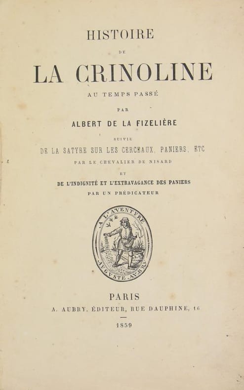 Paris, A. Aubry éditeur, 1859. In/12 en papier dominoté, 106 pages. Déjà fort en vogue en 1859, la crinoline, bien que décriée par les hygiénistes et moquée par les caricaturistes fut encore portée de longues décennies.