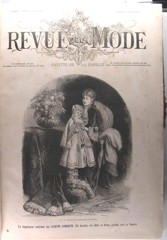 Gazette de la famille, Revue de la mode 1883 (12è année) de janvier à décembre. In folio reliure demi-toile, Reliure très abîmée et atteinte au papier sur la tranche. 52 gravures lithographiées en couleurs, 416 pages.