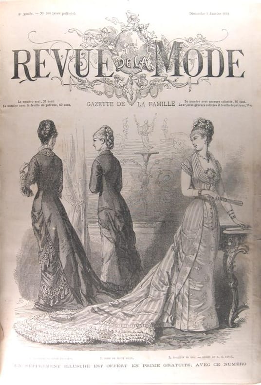 Gazette de la famille, Revue de la mode 1883 (12è année) de janvier à décembre. In folio reliure demi-toile, Reliure très abîmée et atteinte au papier sur la tranche. 52 gravures lithographiées en couleurs, 416 pages.