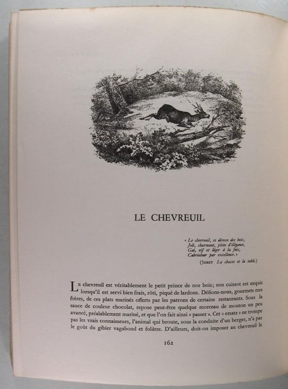 Bel exemplaire de ce classique traité sur l'art d'accommoder le gibier. Un des exemplaires numérotés sur alfa. Nombreuses illustrations dans le texte.