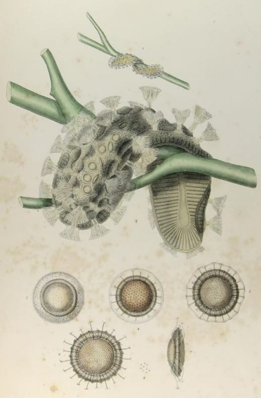 Peau usée sur les chasses et en plusieurs endroits des plats et des nerfs ; quelques manques. Papier des plats usé par frottement. Quelques rares taches d’oxydation depuis la page de garde jusqu’à la page 9. Rousseurs plus importantes sur les planches 1, 2, 3, 5, 6, 7 8, 9. Anciennes traces claires de mouillure en fin de volume.Outre la découverte des statoblastes, Almann expose sa thèse sur l’alternance de génération chez ces espèces. Annales des sciences naturelles par Audouin, Brongniart, Dumas, 1857, p. 256. Archives des sciences physiques et naturelles, Université de Genève, 1858, p.205. Fermeture de la Librairie du 30/12/2025 au 11/01/2026