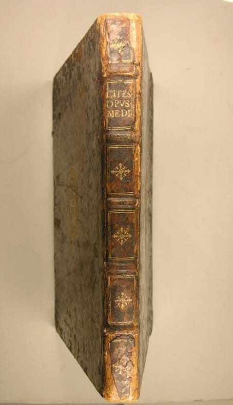 Parisiis, Sebastianum Cramoisy, 1639, in-4, 11 ff, 302 pp, 3 ff, Veau fauve marbré, dos à nerfs orné. Restaurations aux coins et aux mors. Reliure de l?époque, Il s'agit du seul recueil des oeuvres complètes de François Citois. On y trouve la première édition du traité sur les saignées et les purges, le traité sur l'abstinence et la première description fidèle de la colique du Poitou. Le dernier traité, en français, concerne les remèdes contre la peste, dont celui-ci : « Un chapon noury de chair de vipère est excellent en ce temps. Les Italiens en usent pour prolonger leurs jours. » François Citois (1572-1652), né à Poitiers, fut le médecin personnel de Richelieu et de Louis XIII. Couverture rigide