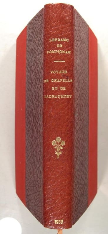 Exemplaire sorti des presses d'Hubert Cazin. Les éditions Cazin étaient très réputées pour leur qualité, mais aussi pour leur caractère licencieux, ce qui valut à l’éditeur la saisie de livres, une amende ainsi que deux séjours à la Bastille. L'ouvrage s'ouvre sur un délicat frontispice gravé (non signé). ''Un charmant frontispice par Marillier gravé par Delaunay''. (in Cohen). ''Le Voyage de Chapelle et Bachaumont les conduit à traverser la vallée de la Loire, le Bordelais, le Languedoc et la Provence pour se rendre à Encausse, petite station thermale au pied des Pyrénées. Il s'agit peut-être d'un exil masqué en voyage d'agrément. Ce récit, souvent réduit à un chant hédoniste, a indéniablement une connotation politique aussi bien que philosophique.'' (Laurence Rauline et Bruno Roche). Manuel du Cazinophile, p. 120 / n°LVII (pour un exemplaire millésimé 1783) - Laurent Coulet, Catalogue d'éditions Cazin, 16 (1777) - Cohen, Guide l'amateur de livres à figures du XVIIIème siècle, 78. Angles élimés. Dos présentant un éclat altéré. Petit frottement et infime manque superficiel en marge de chacun des plats. Coiffe de tête élimée. Discrète cerne angulaire au frontispice. Rares tout autant que discrètes rousseurs dans le texte. Infime travail de ver affectant le fond de cahier de rares feuillets. Du reste, bonne condition.