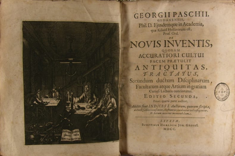 Georg Pasch (1661-1707) était un philosophe allemand, professeur de morale, de logique, de métaphysique et de théologie. Il fut en contact avec les plus grands intellectuels de son temps, dont Th. Hobbes. Il développa un concept d’invention différent de celui de Bacon, basé sur l’idée de genèse des Arts, selon laquelle les différents arts apparaissent à mesure que les besoins vitaux sont comblés. Contient 7 parties sur les Arts Libéraux, la Morale, la Justice, la Médecine, la Physique, les Mathématiques, la Mécanique etc. On trouve aussi quelques passages en allemand sur la saignée, le narguilé, le calendrier, le poêle à bois, la baguette de sourcier, etc. Bib : KRIVATSY 8636.