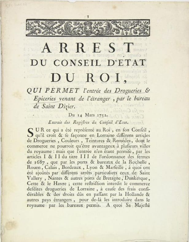 Quelques petites taches. Hormis cela, très frais.Autorisation d’entrée des drogueries, couleurs, teintures et remèdes fabriqués en Lorraine sur le territoire français. Avec la garantie de M. Rossignol de diffuser cet arrêt dans tout le département lyonnais. Fermeture de la Librairie du 30/12/2025 au 11/01/2026