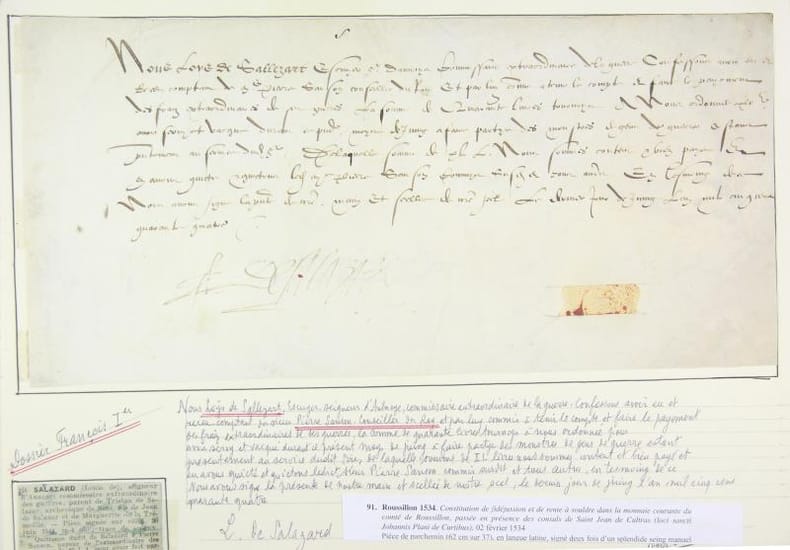 “Nous Loys de Sallezard, Escuyer, seigneur d’Aulnoye, commissaire extraordinaire de la guerre, confessons avoir eu et receu comptant du sieur Pierre Sanson, Conseiller du Roy, et par luy coimmis à tenir le compte et faire le payement des frais extraordinaires de ses guerres, la somme de quarante livres tournoys à nous ordonnée pour avir servy et vacqué durant ce présent moy de juin à faire partie des monstres de gens de guerre estant au service dudit sire [...]” Extrait.Par Louis de Salazard, seigneur d’Aunoy, parent de Tristan de Salazard, archevêque de Sens.