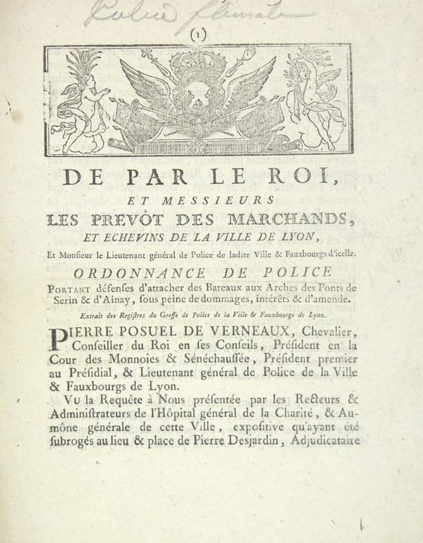 Très petit manque vers un des coins. Très bel état.“Nous, Lieutenant général de Police susdit, faisons défenses à toutes personnes, d’attacher aucun Bateau aux arches des Ponts qui traversent, du quartier de Serin au quartier des deux Amants, & l’autre du quartier d’Ainay au quartier de Saint Georges, à peine, contre les Contrevenants, de tous dépens, dommages & intérêts, & de l’amende de vingt-cinq livres au paiement de laquelle les Contrevenants seront contraints même par corps” Extrait. Fermeture de la Librairie du 30/12/2025 au 11/01/2026