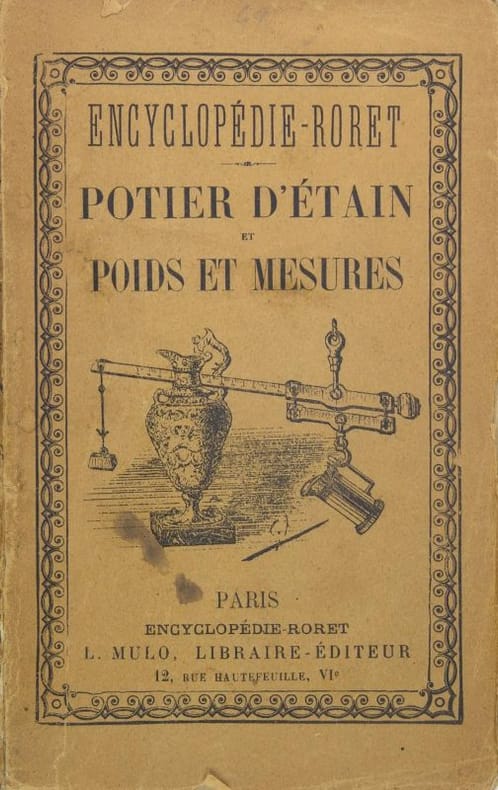 Dos cassé.Contenant la fabrication de la poterie d’étain, mesures à liquides, étains d’art poids en fonte de fer, poids en cuivre, mesures de capacité en fer-blanc, mesures en bois, mesures en longueur, mètres en bois, mètres en baleine, en ivoire, chaîne d’arpenteurs, balances, bascules, alcoomètre centésimal de Gay Lussac.