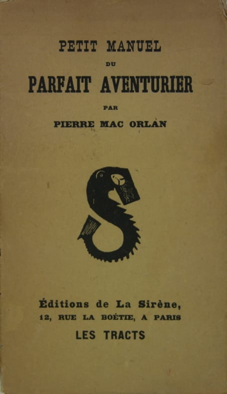 Editions de la Sirène / Collection " Les Tracts " 1920. In-12 broché oblong de 86 pages au format 10,5 x 18 cm. Couverture rempliée, avec titre imprimé et petite vignette en noir représentant une Sirène. Dos carré. Plats et intérieur frais. Exemplaire non coupé, imprimé sur alfa, après 33 grands papiers. Superbe état général. Edition originale de ce savoureux manuel de l'aventurier " Passif ".