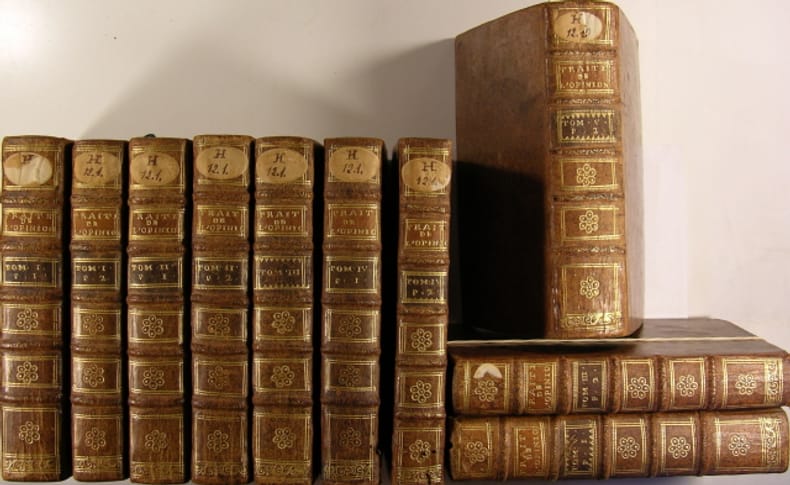 6 volumes petits in-12°, reliure cuir veau de l’époque, dos à 5 nerf avec caissons à fleurons, titre et tomaison sur deux pièces de cuir (l’une marron, l’autre verte). Tome 1: 626 pages. Tome 2:625 pages.Tome 3: 568 pages. Tomz 4: 515 pages. Tome 5: 566 pages. Tome 6: 597 pages dont une Table de 187 pages. Il s’agit de l’édition originale. L’auteur (1668-1746) fut Maître des Requêtes, haute fonction judiciaire etg administrative. Signalons que le tome 4 s’occupe des sciences occultes et de la magie... Plusieurs traces d’usage et d’âge mais, dans l’ensemble, BON ETAT.
