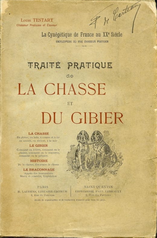 Paris, H. Laurens, Libraire-Editeur ; Saint-Quentin, Imprimerie Paul Lebrault, S. d. (1900). Grand In-8, demi-reliure dos à faux nerfs avec piece de titre et cor de chasse en fleuron,664 pp. Cette encyclopédie du chasseur contient une multitude d’articles intéressants sur le gibier de plaine, de bois, à courre et à tir, au marais, en rivière, à la mer. Comment on l’élève, comment on le chasse, comment on le conserve, comment on le prépare. L’histoire de la chasse et des armes de chasse. Le braconnage. Il traite également de la fauconnerie, de la chasse au miroir, des pièges, des loups, nombreuses recettes de cuisine, un important chapitre est consacré aux chiens. Edition originale rare. Thiébaud, 885.
