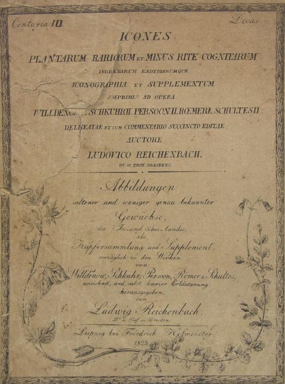 - Pritzel 8443.Heinrich Gottlieb Ludwig Reichenbach (1793-1879) étudie la médecine et les sciences naturelles à l’université de Leipzig. Parallèlement à ces fonctions, il dirige le musée zoologique de Zwinger. Professeur titulaire de la chaire d’histoire naturelle à l’Académie de médecine et de chirurgie de Dresde. Il fonde le jardin botanique de Dresde qu’il dirige jusqu’à sa mort. Covers and sheets unbound 4to, 92 p., 65 engraved plates drawing by the author. Uncut an unoppened shets & plates. Upper cover & title page staineds and damaged. Some plates also dusty and foxed, 4 plates oxidized. 65 plates on 92 (complete list below).207, 221, 222, 223, 224, 225, 226, 228, 229, 231, 232, 233, 234, 237, 239, 240, 241, 242, 243, 244, 245, 246, 247, 248,249, 250, 251, 252, 253, 255, 256, 257, 258, 259, 260, 261, 262, 263, 265, 266, 267, 268, 269, 270, 271, 272, 273, 274, 275,276, 277, 278, 279, 280, 281, 282, 287, 288, 290, 291, 292, 295, 296, 297, 299.