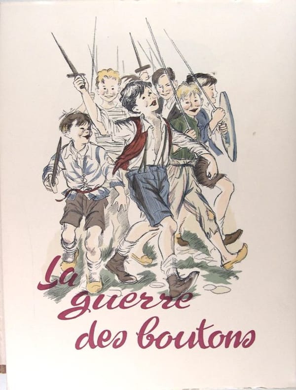 La Guerre des boutons est un roman français écrit par Louis Pergaud, écrivain franc-comtois, et publié en 1912. Il décrit la « guerre » que se livrent les bandes d'enfants de deux villages rivaux, Longeverne et Velrans, dans la campagne franc-comtoise de la fin du XIXe siècle. L'auteur s'est inspiré de la vie dans le village de Landresse, dans le département du Doubs, où il a enseigné deux ans. Le titre vient du butin de cette guerre, constitué en majorité par les boutons dont les vaincus sont dépouillés par les vainqueurs. Le récit, pour la plus grande partie, raconte l'histoire du point de vue des enfants de Longeverne. Louis Pergaud remporta le prix Goncourt avec De Goupil à Margot, Histoire de bêtes en 1910, mais c'est avec La Guerre des boutons qu'il rencontra le succès. Il fut tué près de Marchéville (dans les environs de Verdun) le 4 avril 1915. Insolation au dos et légères usures et salissures à l'étui.