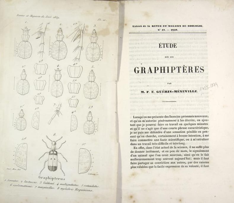 Félix Édouard Guérin-Méneville (1799 -1874) est un entomologiste français. Il est l’auteur de près de 400 publications sur les insectes, parmi lesquelles l’”Iconographie du Règne Animal” de Georges Cuvier 1829-1844 comprenant deux volumes et 4 600 figures complétant l’œuvre de Georges Cuvier (1769-1832) et de Pierre André Latreille (1762-1833).Le présent ouvrage est extrait de la revue fondée par l’auteur “la Revue et Magasin de zoologie pure et appliquée”.