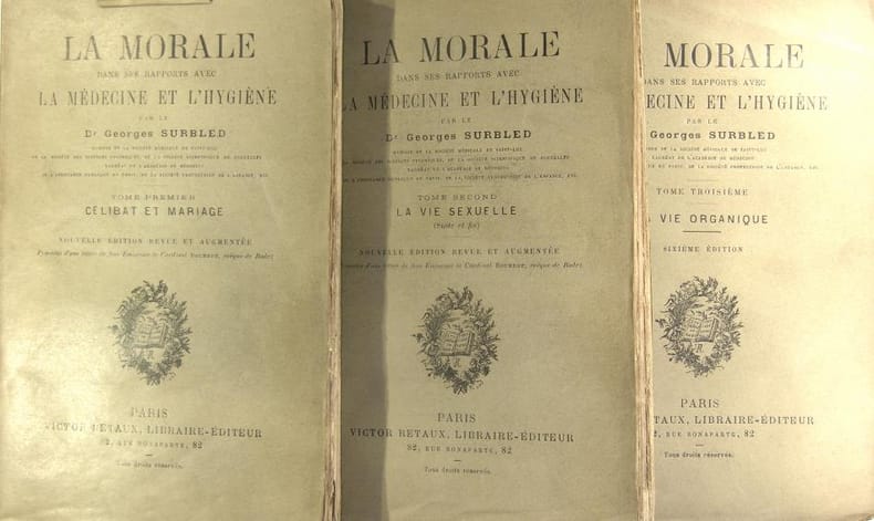Paris, Victor Retaux, 1900. 3 volumes in/8 broché, couvertures imprimées, 302 pages, 297 pages & 335 pages. Excellent état des volumes partiellement non coupés. Célibat et mariage, la vie sexuelle, la vie organique.