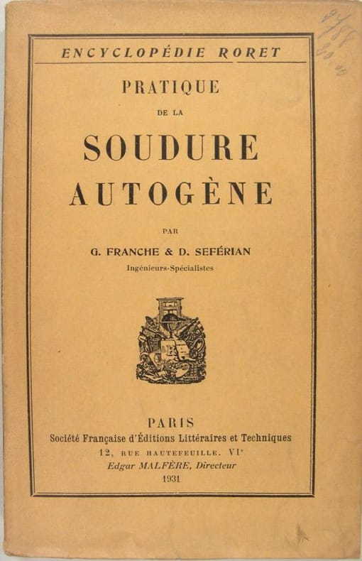 257 figures dans le texte en noir, quelques planches publicitaires sur papier vert édition spéciale de 1912-1913 Contents, Chapitres : Avant-propos - Les différents modes d'assemblage permanents des pièces métalliques - Soudure autogène au chalumeau, cas d'application - Oxygène - Acétylène - Chalumeaux oxy-acétyléniques - Les postes de soudure, fonctionnement - Propriétés des métaux considérées au point de vue de la soudure autogène - Métaux et produits d'apport - Préparation des soudures - Notions générales sur l'exécution des soudures - Soudure du fer et des aciers doux, des aciers durs - Soudure de la fonte, du cuivre, des laitons, des bronzes, de l'aluminium, du plomb, de métaux et alliages divers - Machines à souder - Coupage des fers et aciers par les chalumeaux à jet d'oxygène tache discrete sur le haut du plat supérieur du cartonnage et un peu accentué sur le haut du plat inférieur, le cartonnage reste solide, intérieur sinon tres frais et propre, cela reste un bon exemplaire de lecture