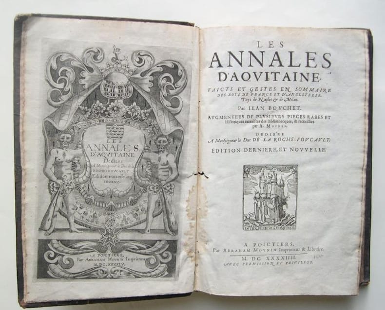 Abraham Mounin Imprimeur et Libraire 20,5 x 30 A Poictiers 1644 Fort in-folio, reliure pleine basane marbrée de l'époque habilement restaurée, dos à cinq nerfs ornés de six caissons dorés et fleuronnés, titre doré, comprenant 5 parties : Partie 1 : Les Annales d'Aquitaine par Jean Bouchet, page de faux titre en frontispice gravée surmontée des armes de François 1er duc de la Rochefoucault (1588-1650) à trois chevrons de gueule, deux sauvages de carnation armés de massues , édition nouvelle et augmentée, page de titre avec vignette de l'imprimeur "Inter pericula constans", [30], 666, [2 bl.] pp. Partie 2 : Les mémoires et recherche de France et de la Gaule Aquitanique du sieur Jean de la Haye, baron des Coutaux, lieutenant général en la sénéchaussée de Poictou, & siège présidial de Poictiers, 69 pp. avec page de titre propre, Abraham Mounin, 1643. Partie 3 : de l'Université de la ville de Poictiers...extraict d'un ancien manuscrit latin, gardé en la bibliothèque de Me Jean Filleau...Fondation et dotation de l'Eglise de Saincte Radegonde, Inscription en l'Eglise cathédrale de Poictiers, page titre Abraham Mounin 1643, [8], 58 pp. Partie 4 : de l'Université de la ville de Poictiers...extraict du scribe de l'Université et d'un ancien manuscrit latin, gardé en la bibliothèque de Me Jean Filleau..., page titre Abraham Mounin 1643, [16] pp. 59-75, [7] pp. , la dernière blanche, représentation de Sainte Radegonde hors texte in fine "Patrona Pictaviensium". Partie 5 : la preuve historique des litanies de la grande reyne de France Saincte Radegonde contenant par abrégé les actions miraculeuses de sa vie tiréees des historiens français par Jean Filleau..., page de titre Abraham Mounin, 1643, 204 pp., gravure hors texte "Portrait du miracle arrivé à Pressac le jeudy absolu second jour d'avril 1643" comprise dans la pagination. La première édition des "Annales d'Aquitaine" date de 1524. Elles ont été copiées et rééditées à de nombreuses reprises. Notre édition est la dernière en date, mais la plus complète. L'ouvrage de Jean Bouchet (Poitiers, 1476 - 1557) s'inscrit ici dans la tradition des grands chroniqueurs de l'histoire de France; mais il inaugure également "la méthode historique moderne par l'attention aux sources régionales de préférence aux compilations" (Régis Rech). Les textes du Poitevin Jean Filleau (1600-1682), avocat du Roi au Présidial de Poitiers, font de cet ensemble une source unique pour l'histoire de l'Aquitaine et plus largement pour l'histoire du royaume de France. Belle restauration de la fin du XXe siècle, page de faux titre renforcée, portrait du duc de la Rochefoucault est absent, légère trace de mouillure au bord supérieur des cinq derniers feuillets, papier un peu jauni. Bel exemplaire et intéressante provenance Ex-libris manuscrit (XVIIe ou XVIIIe) "ex libris abbatia omnium sanctorum andegavensis" [l'abbaye Toussaint d'Angers fondée au XIe siècle). Tampon humide du XIXe sur la page de titre "Petit séminaire de Combrée" [Maine & Loire, fondé en 1810, diocèse d'Angers). (EvB64) PHOTOS NUMERIQUES DISPONIBLES PAR EMAIL SUR SIMPLE DEMANDE-DIGITAL PHOTOGRAPS MAY BE AVAILABLE ON REQUEST Livre