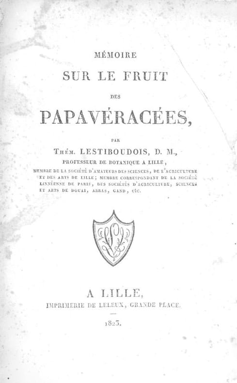 Gaspard Thémistocle Lestiboudois (1797 - 1876) fut un médecin, un botaniste et homme politique français. Fils du botaniste François-Joseph Lestiboudois et petit-fils de Jean-Baptiste Lestiboudois (1715 -1804), professeur de botanique à la faculté des sciences de Lille. Il obtient son titre de docteur en médecine en 1818 à Paris. Il se rend en Algérie pour y étudier l’épidémie de peste de 183. Il présente à la Faculté des sciences de Paris une thèse de botanique en 1848 sur la phyllotaxie anatomique (ordre dans lequel sont implantés les feuilles ou les rameaux sur la tige d’une plante, ou, par extension, la disposition des éléments d’un fruit, d’une fleur, d’un bourgeon ou d’un capitule). La présente plaquette traite de la famille des pavots, coquelicot.