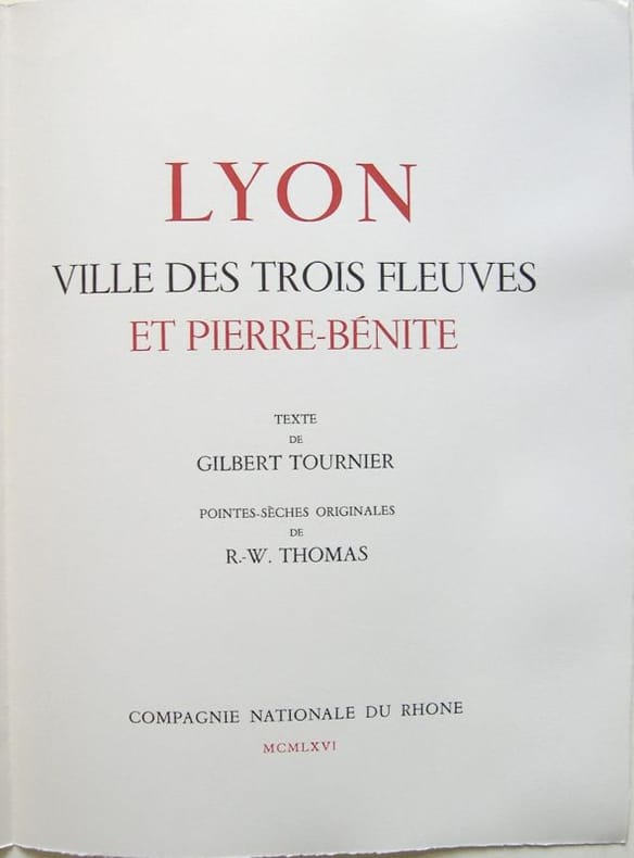 Compagnie Nationale du Rhône, 1966. In folio en feuilles sous couverture rempliée de papier chiffon sous étui cartonné, pointes sèches dont certaines à double pages de R. W. Thomas, 67 pages. Un des 300 exemplaires sur vélin pur fil à la forme des papeteries de Rives. Titre écrit à la main sur le dos de la couverture.