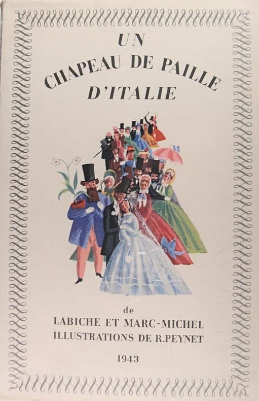 Un volume in 8° (25 x 16 cm), reliure de luxe rigide ,avec des plats de couleur crème. Le 1er présente une sorte de médaillon coloré (une place parisienne à l’époque de Labiche avec un fiacre au premier plan, emportant deux voyageur qui fuient visiblement un couple en arrière plan: un père et sa fille ). Le dos est illustré lui aussi par PEYNET avec 5 des personnages de la comédie de LABICHE (on reconnait parmi eux le père et sa fille en tenue de mariée vus sur le 1er plat)1908-1999). PEYNET est un illustrateur très populaire connu surtout pour ses dessins, humoristiques et poético sentimentaux, représentant presque toujours un éternel couple d’amoureux. La couverture initiale est conservée et notre exemplaire compte 143 pages , avec 50 illustrations in-texte et 5 illustrations pleine page toutes sgnées PEYNET) . Il s’agit ici du grand classique de LABICHE , une comédie boulevardière accumulant des péripeties plus rocambolesques et burlesques les unes que les autres, à l’occasion de la recherche effrénée d’un chapeau de paille un jour de noce... Notre exemplaire semble unique en son genre, avec sa reliure de luxe non signée et une impression sans le moindre justificatif . TRES BON ETAT/