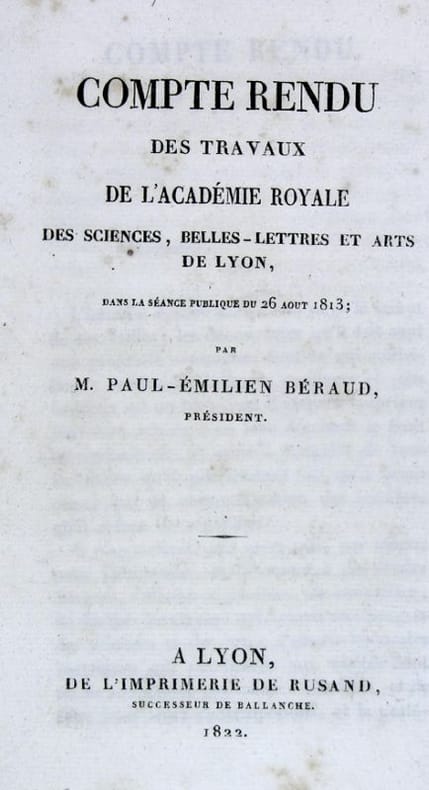 A Lyon, de l’imprimerie de Rusand, 1822. Plaquette in/8 en couverture d’attente, 46 pages. Corps du texte légèrement oxydé.