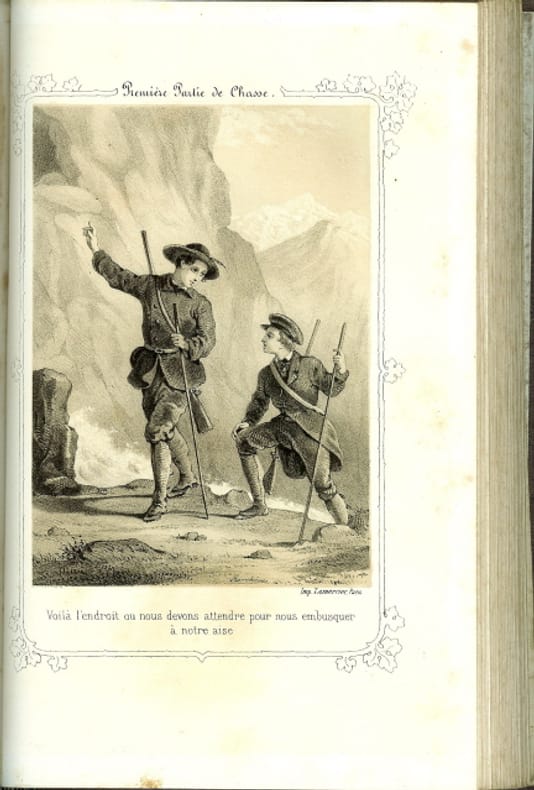 Paris, Lehuby, s.d. (vers 1850). Grand in/8 reliure demi-chagrin marron, dos à nerfs à caissons dorés, doré trois tranches, 12 lithographies deux tons hors-texte dont 2 sur la chasse, 330 pages. Les serpentes sont oxydées.