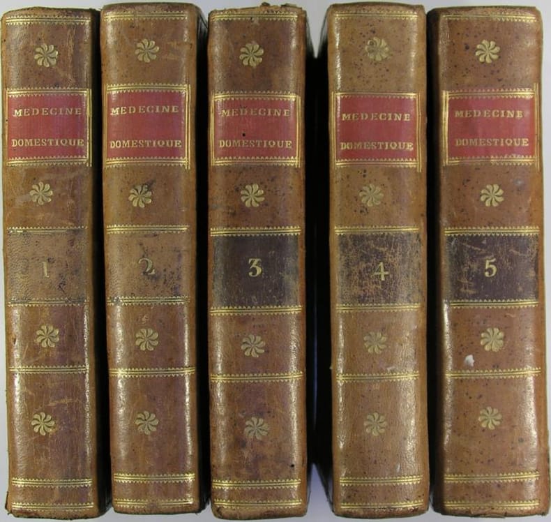 Paris, G. Desprez, 1780. 5 volumes in-8 (13x20.5cm), plein veau moucheté époque, dos à 5 nerfs ornés, pièces de titre et de tomaison, tranches rouges, coiffes arasées. Illustré d’un portrait en frontispice, (2)-CVIII-392pp. ; (2)-518pp. ; (2)-618pp. ; (2)-597pp.-(1) ; (2)-591pp. Un intéressant et très complet aperçu des connaissances usuelles en médecine à la fin de l’Ancien Régime (Diagnostique et soin des maladies, hygiène alimentaire, diététique, hygiène du travail, choix des vêtements, inoculation, obstétrique, etc…) Belle série, bon exemplaire et bon état.