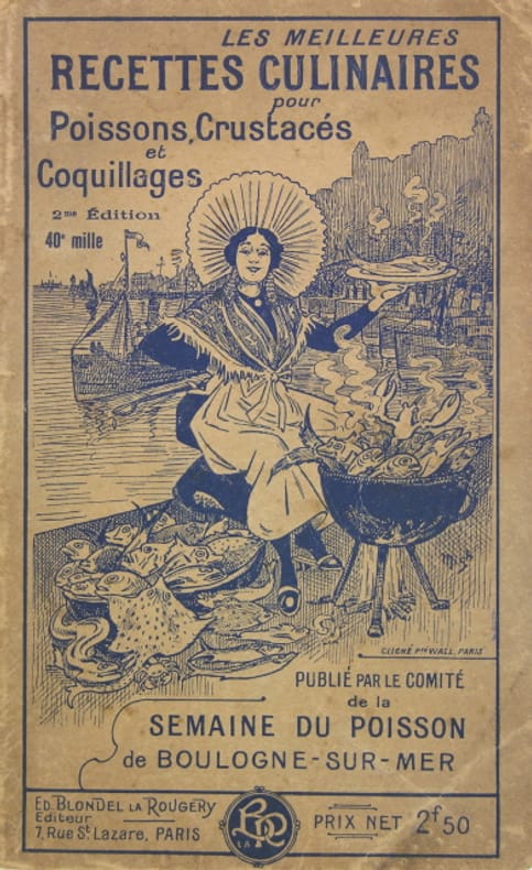 Comité de la semaine du poisson de Boulogne/Mer,Paris Bondel & Rougery,Softcover in-8° broché,1925 couverture illustrée. 104 pp. Troisième édition de ces recettes de poisson frais, salé, fumé, en conserves, homard, langoustines, coquillages, crabes, langoustes et crevettes. Illustrations in-texte.