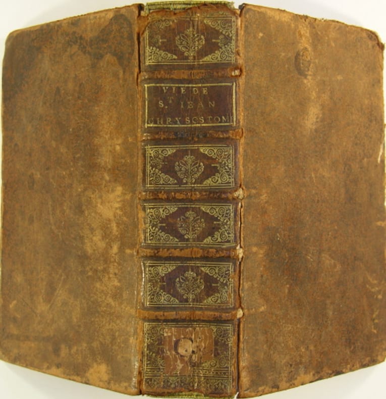 Jean Chrysostome (Antioche entre 344 et 349, mort en 407 près de Comana) a été archevêque de Constantinople et l'un des pères de l'Église grecque. Son éloquence est à l'origine de son surnom de Chrysostome. Cependant, sa rigueur et son zèle réformateur l'ont conduit à l'exil et à la mort. C'est un saint de l'Église catholique, de l'Église orthodoxe et de l'Église copte, fêté le 13 septembre en Occident et le 30 janvier en Orient.2 volumes in one fat 8vo in full contemporary calf, ribbed spine with gilt panels and label, engraved vignette in title page, head & tail-pieces, [8], 1059 p. Few flaws : tips lacking, joints partially cracked, rubbing on borders & joints, small & decreasing spot on upper border of some sheets.