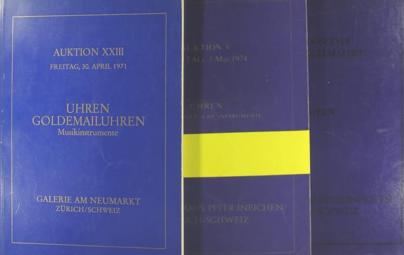 Lot 3 catalogues Horlogerie) : Catalogues de vente aux enchères 1971 - 1974 & 1977. In/8 broché, illustrations en noir, 3 planches en couleur. Texte en langue Allemande. Quelques notes manuscrites en marge.