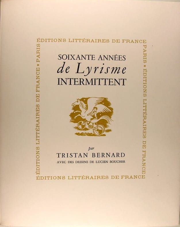 Tristan Bernard, de son vrai nom Paul Bernard, né à Besançon le 7 septembre 1866 et mort à Paris le 7 décembre 1947, inhumé au cimetière de Passy, romancier et auteur dramatique français. Il est célèbre pour ses mots d'esprit. Il aurait inventé le jeu des petits chevaux.Lucien Boucher dessinateur, graveur, affichiste et illustrateur français né à Chartres en 1889 et mort en 1971. Diplômé de l’École de céramique de Sèvres, il commence sa carrière en tant que caricaturiste pour l'hebdomadaire humoristique Le Rire et contribue également à quelques numéros de Fantasio. Il se consacre principalement à partir des années 1920 à la création d'affiches pour le cinéma et la publicité et réalise de nombreuses lithographies inspirées du surréalisme. Il est connu principalement pour une série d'affiches publicitaires et de planisphères réalisés pour Air France.