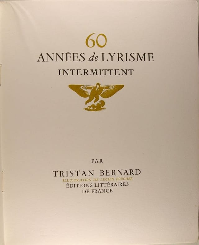 Editions littéraires de France, 1945, in-4 broché de 122 pages sous emboîtage, couverture illustrée rempliée, dessins et culs-de-lampe de Lucien Boucher, 2 planches hors-texte : Tristan Bernard par Toulouse-Lautrec et Tristan Bernard par Vuillard. Tirage limité à 1520 exemplaires sur vélin de Rives numérotés. Excellent état.