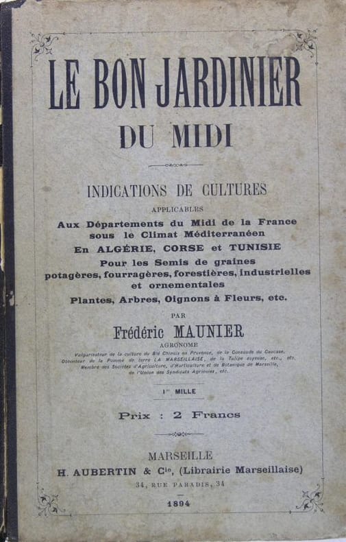 Indications de cultures applicables aux Départements du Midi de la France sous le Climat Méditerranéen. En Algérie, Corse et Tunisie. Pour les semis de graines potagères, fourragères, forestières, industrielles et ornementales. Plantes, Arbres, Oignons à Fleurs, etc. Marseille. Aubertin. 1894. In-8 (130 x 198mm) cartonnage dos toile noire, plats imprimées, 339, (3) pages. Coins un peu abîmés, exemplaire lgt débroché, reste correct.